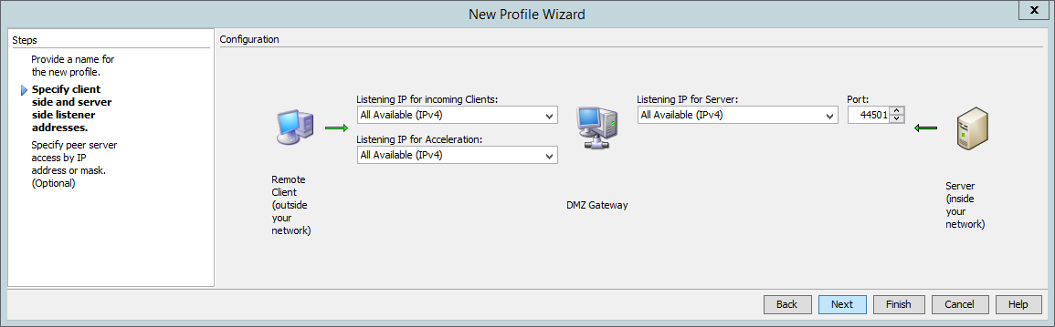 Creating a DMZ Gateway Profile includes specifying the listening IP address for incoming clients, specifying the listening IP addresses and port for the connecting application, and specifying the IP addresses that are allowed or denied access.