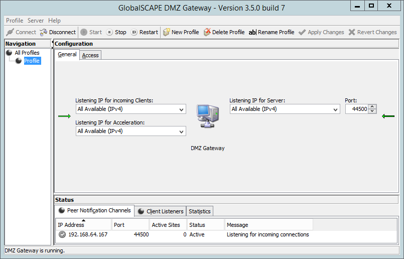 In the default view, with All Profiles selected, the right pane displays the status of the DMZ Gateway service and the status of all Profiles.
