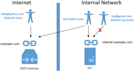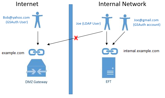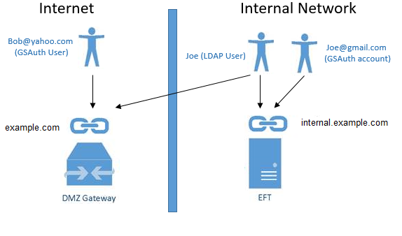 Globalscape authentication users and LDAP users can log in using the internal (EFT) URL OR external (DMZ Gateway) URL. This configuration allows remote users to access EFT through DMZ Gateway.