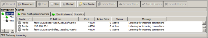 In the DMZ Gateway administration interface, you can view a variety of statistics. Whether you click All Profiles or a specific Profile, the Status area displays information about Peer Notification Channels and Client Listeners, as well as the size and speed of server and client data being transferred.