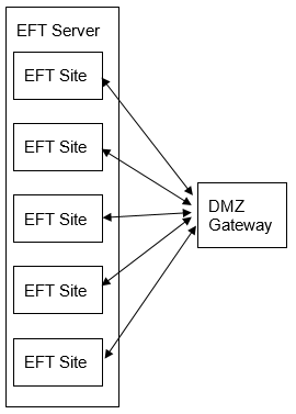 • There can be a many-to-one correspondence of EFT Sites (an EFT construct) to a DMZ Gateway, with a multi-Site DMZ Gateway serial number