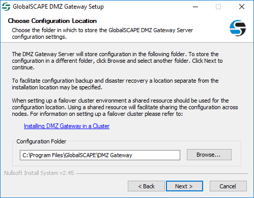 In the Configuration Folder box, specify the path at which to store configuration files for DMZ Gateway. The installation location is specified by default, but you can specify a separate location for backup and disaster recovery or for shared resources, such as with a cluster environment.