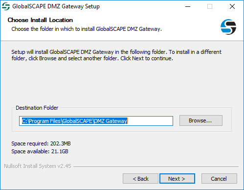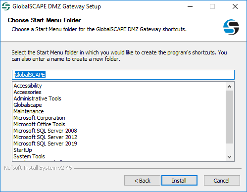 A shortcut to open the DMZ Gateway interface will be installed on the Start menu in a folder called Globalscape. You can keep this default location or specify a different location in which to install the shortcut.