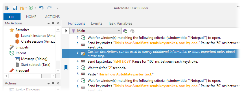 Another way to document instructions, notes or other important information directly onto the Steps panel is by adding Comments. If you import a task that includes an unlicensed action / activity, whether or not it contains a custom description, the Steps panel will always display the unlicensed step (in Visual view) as currently unlicensed. Running a task with an unlicensed step will always fail at that step. You can bypass the step by disabling it or removing it altogether.