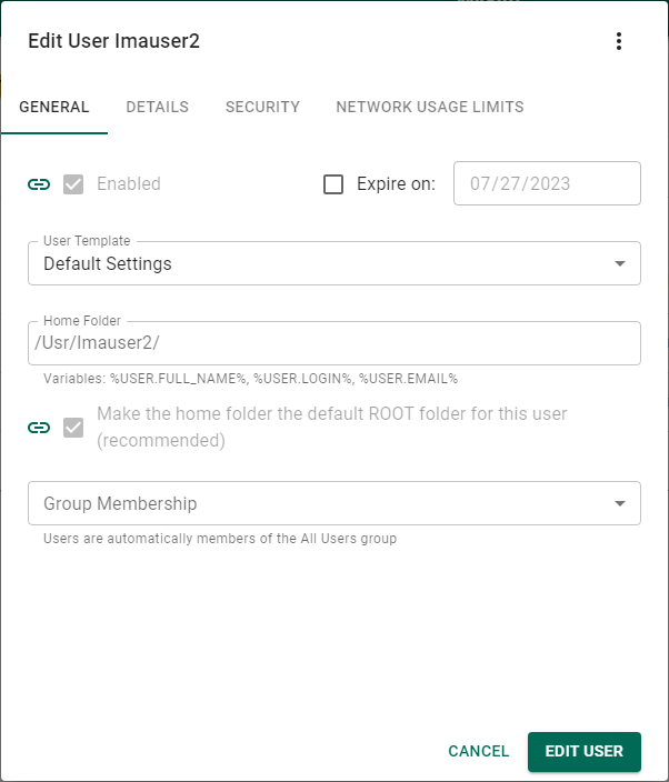 On the General tab, edit the properties of this user, as needed, then click Edit User to apply.