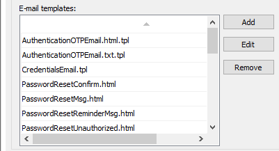 In the Email templates area, you can add, edit, and remove email templates used by EFT and Workspaces to send notifications regarding authentication, credentials, passwords, and PGP key expiration errors. (Refer to EFT Messages and Templates for details of the templates.)