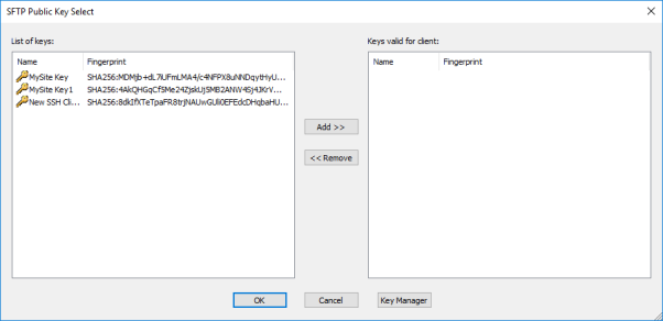 The SFTP public keys that are defined for this Site appear in the List of keys. If no keys appear, click Key Manager to import keys.