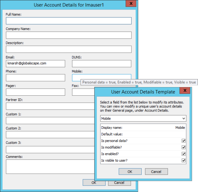 If your organization is required to adhere to privacy regulations such as GDPR, you should specify the settings in the User Account Details Template before continuing. Each field in the User Account Details dialog box has a privacy policy assigned to it in the User Account Details Template on the Site > Security tab. The privacy policy determines whether the administrator can view or change the user account details for a user.