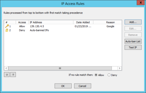 In the Network Usage and Security Settings area, next to IP access/ban list, click Configure. The IP Access Rules dialog box appears.