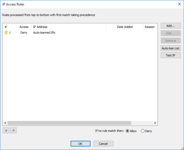The IP Access Rules dialog box appears. The default configuration is to deny access to automatically banned IP addresses. By default, if no rule matches an IP address, then the IP is allowed.