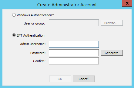 Specify either Windows Authentication or EFT Authentication.