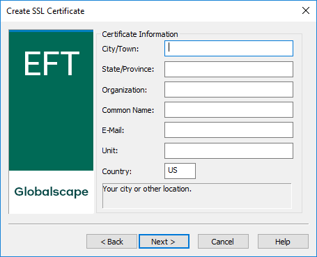 A certificate on the client must be associated with EFT to initiate an SSL connection. When you are administering EFT on the local computer, you can import your own certificates or create new ones using the Certificate Creation Wizard (described below).
