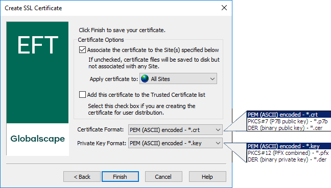 In the Apply certificate to box, specify which components of EFT are affected (administration Service, All Sites, or a specific Site).