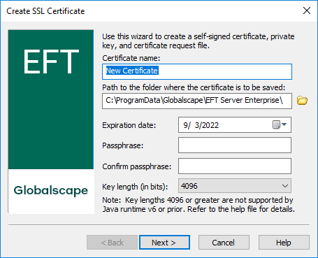 The Certificate Creation Wizard does not create SHA-2 certificates; however, EFT can apply a SHA-2 certificate generated through other means, like certificate authorities and third party applications.