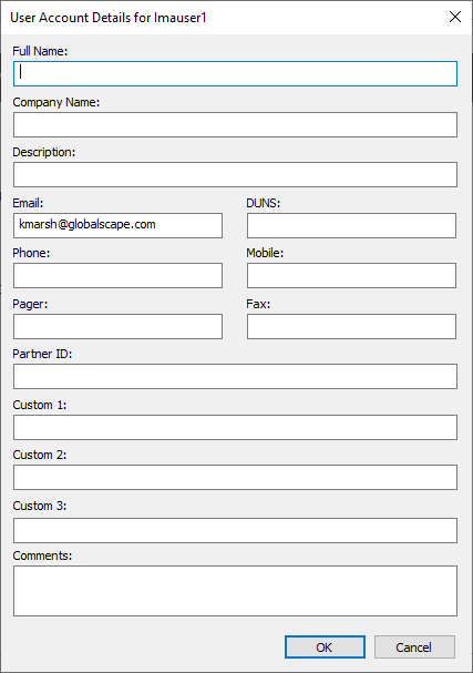 - Provide the user account Name, Description, Phone, Fax, email, and/or Pager information. In the Custom 1, Custom 2, Custom 3, and Comments boxes, you can provide other phone numbers, office numbers, mail box number, location, and so on. The email address box cannot contain more than 255 characters. You can specify multiple email addresses, separated by semicolons.