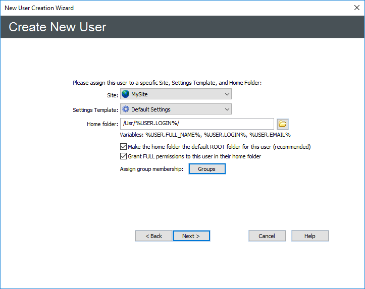 Select the Grant the user full permissions in their home folder check box if you want the user to have full permissions to their home folder.