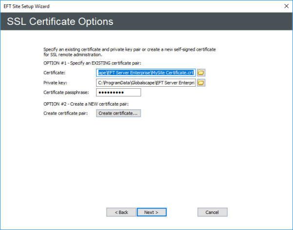 2. Specify the AS2 Certificate public path key, Certificate private key path, and Certificate private key passphrase, populated by default with the SSL certificate paths (if present) for EFT SSL communications. Click the folder icons to specify a certificate pair or click the blue create link to open the SSL certificate wizard to create a new certificate pair. (You can use the same SSL certificate that you are using for the Site.) Click Next.