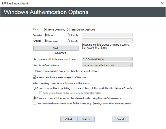 6. In the Type area, click Active Directory or NTLM/Local System Accounts to match the authentication method used on EFT's domain. Authentication is done with Microsoft's LogonUser() function in Windows. The operating system then determines which method to use for authentication, such as Kerberos, NTLM2, etc.