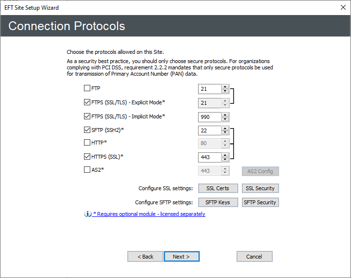 19. Select one or more check boxes for the protocol(s) that this Site will use to connect to EFT and specify the port number for each protocol. The default ports appear in the boxes.