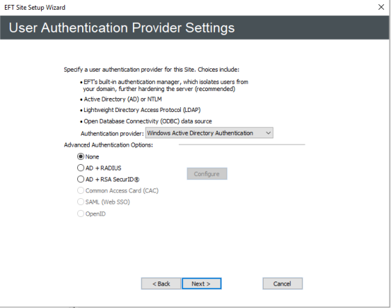 • RADIUS - If EFT is connecting to a server using RADIUS, click Configure. and configure the site to use RADIUS for authentication.