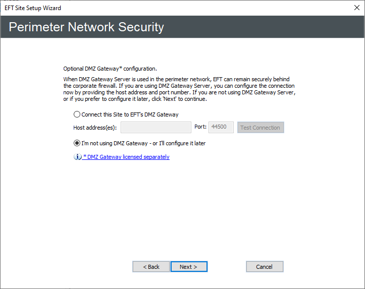 • If you have not yet installed or configured DMZ Gateway Server, click I'm not using the DMZ Gateway - or I'll configure it later.