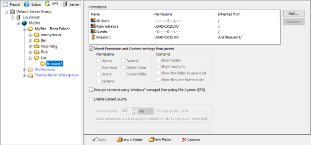Just as User Settings Templates control access to EFT resources such as bandwidth allowances and connectivity privileges, the Permission Groups control access to folders and the files within. Permission Groups set user virtual file system (VFS) permissions to folders. EFT creates the following default Groups for every Site: Administrator, All Users, and Guests. You can create new Groups and/or modify the settings for the default Groups. Consider your security and access needs, configure Groups according to those needs, then add users to the Groups based on the permissions that you want to allow. The Groups node appears in the left pane under the Site node on the Server tab. (You cannot move Groups between Sites.)