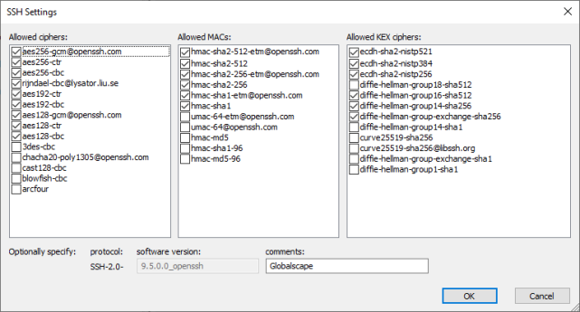 Numerous SFTP encryption algorithms are available in EFT and the Advanced Workflows module. It is up to you to determine which settings to use in your environment.