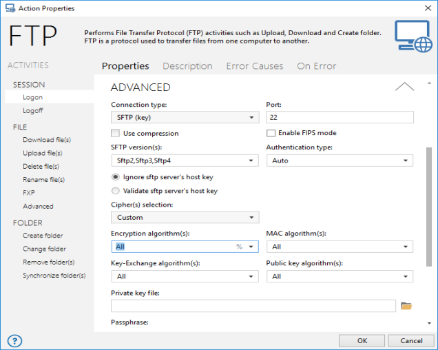 The encryption algorithms, key-exchange algorithms, and MAC algorithms supported by Automate are listed in their FTP - Log On Action, under Advanced. Click the drop-down lists to the Encryption algorithms, MAC algorithms, Key-Exchange algorithms, and Public key algorithms available.