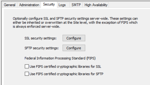The Security tab of the Server node is used to specify SSL versions and allowed ciphers for EFT's Sites, to enable FTPS protocol specific settings, and to enable FIPS for SSL and/or SSH.
