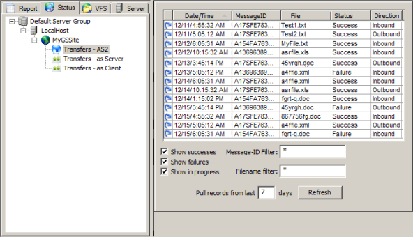 The Transfers - AS2 node is used to view the status of attempted AS2 transactions. For details of viewing AS2 transaction history, refer to AS2 Transaction Auditing and Monitoring.