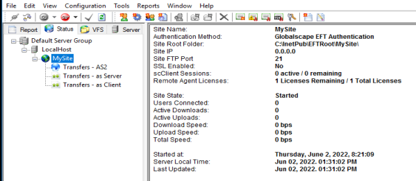 The Site node on the Status tab of the administration interface is used to view the status of the Site and logged-in users, including transfers, when EFT was started, number of users connected, and so on. You can also forcibly disconnect FTP/SFTP users from the Site on this tab.
