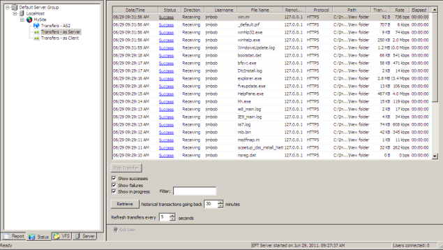 You can view details of transfers to and from EFT on the Status tab. On the Server tab, a node in the tree labeled Activity has two branches: Transfers - as Server and Transfers - as Client. Click one of the branches to open the Status tab to that view.