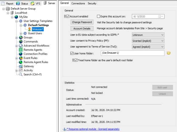 Last time connected: Displays the date and time that the user last connected to EFT.