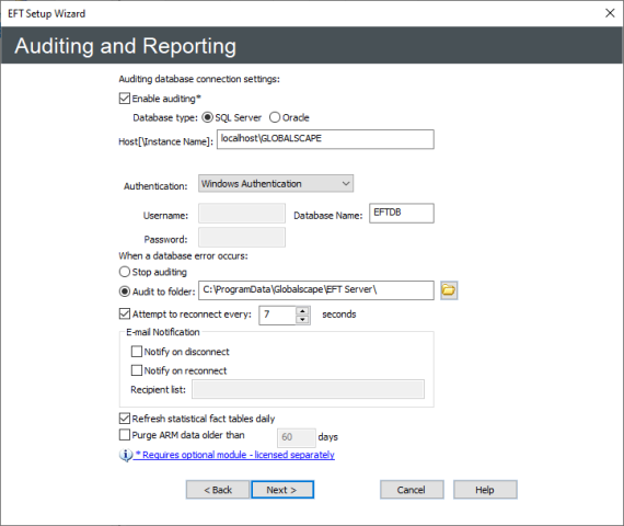 - If you are using Auditing and Reporting, select the Enable auditing check box, then provide the information required to connect to the ARM database as described below. If you are not using Auditing and Reporting, skip to the next step. (Auditing and reporting is a requirement of the PCI DSS.)