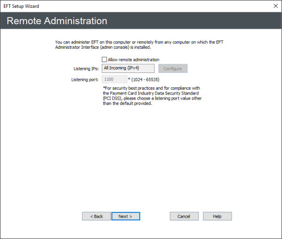 - Click Next. If you chose remote administration, the Secure Remote administration page appears.
