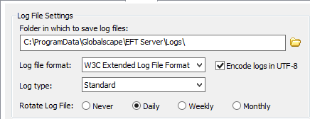 By default, log files are saved in the EFT data directory in the Log folder (for example, C:\ProgramData\Globalscape\EFT Server\Logs). Outbound connection information is audited in that same folder in a log named cl<date>.log.