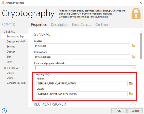 You can also pass other EFT variables into the Advanced Workflow Actions. For example, the path to the OpenPGP keyring files can be passed to the workflow with the %SERVER_PUBLIC_KEYRING_PATH% and %SERVER_PRIVATE_KEYRING_PATH% variables.