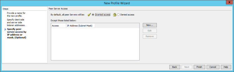 Use the Peer Server Access page to specify the IP addresses or IP masks of peer servers who are allowed or denied access to DMZ Gateway. All IP addresses are granted access by default. Refer to IP Access Exception Dialog Box for details.