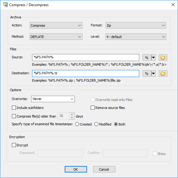To compress files based on age, select the Compress file(s) older than <n> days check box and provide the number of days (default is 30 days), and next to Specify type of examined file timestamps, specify Created, Modified, or Both (the default is Both).