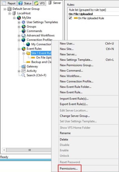 Right-click the Event Rules node, an Event Rules folder, an Event Rule, the Advanced Workflows node, or a Workflow, then click Permissions.
