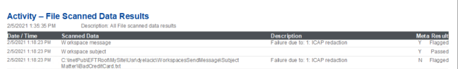 In this example, when a Workspace is created, the File Scan action uses the Clearswift profile to scan any files in that Workspace when it was created. If the scan finds any ICAP violation or redactions, it writes the information to the Windows Event Log. A file in the Workspace named BadCreditCard.txt contains a credit card number, which will fail the File Scan.