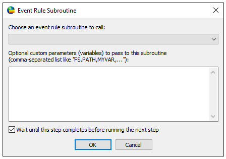 (Requires EAM) The Flow: Subroutine Action allows you to call an Event Rule Subroutine event trigger from within another event rule. The primary purpose of the Flow: Subroutine action is to help you break up larger rules into smaller, reusable ones. Obviously, you would have already created other rules to call. These sub tasks would be rules that you commonly use, such as sending email notifications, moving files, encrypt/decrypt, and so on.