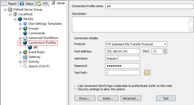 A Connection Profile is a connection settings template to be used in Event Rules that contains the server connection settings. A profile includes the Profile Name, Description, and Connection details such as protocol, host address, credentials, proxy, socks, and so on. A Test button is provided to verify the specified connection options. After you've created the profile on the Site, you can specify it in Copy/Move and Download Actions so that you don't have to define it every time you create a Copy/Move or Download Event Rule. (Connection Profiles require HTTPS, SFTP, or FTPS to connect as the server.)