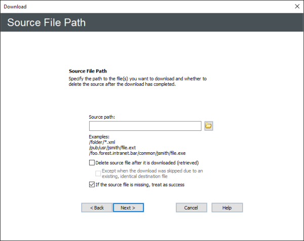 Select the Except when ... check box if you do not want to delete the source file after it is downloaded if the download was skipped.