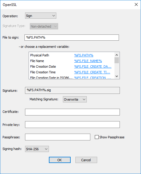 If you clicked Verify Signature, in File to sign, specify the file path, or click another variable in the list of replacement variables. Then specify the Certificate path and click OK.