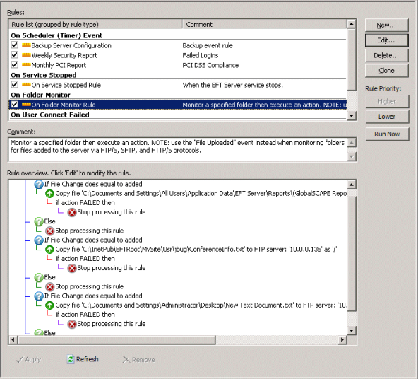 Click Apply to save the changes on EFT. EFT will not save the Rule unless it is adequately defined. Links displayed in the Rule box are parameters that must be defined before you can save and apply the Rule.