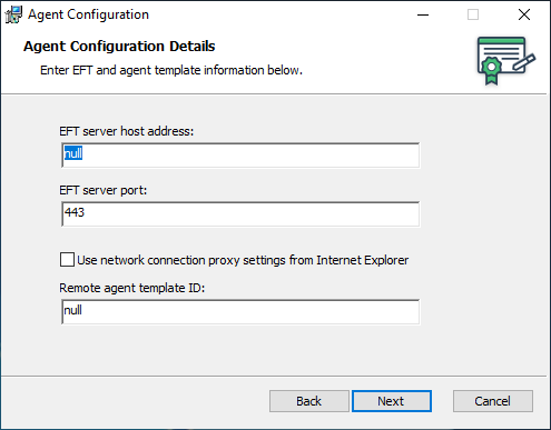 If you are running the installer manually (not from a script) you must provide the EFT server host address, EFT server port, and Remote agent template ID. (The EFT administrator can provide you these from the Remote Agent Template as show in the script procedure above.)