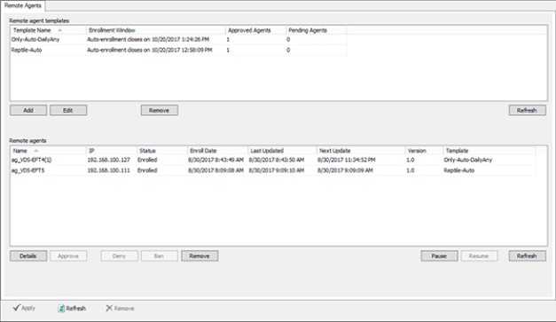 As Remote Agents request enrollment and updates, the Remote Agent's information appears in the bottom half of the Remote Agents tab of the Site.