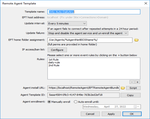 In EFT, a Remote Agent template stores configuration and rules that can be shared by many Agents, and an installer script is generated for each Remote Agent template. Therefore, if one or more remote offices have one set of needs, and another set of remote offices has different needs, a separate remote agent template will distinguish between both sets of offices, allowing you to control each group separately.