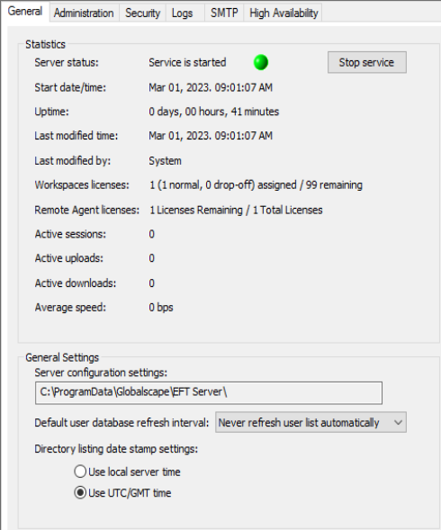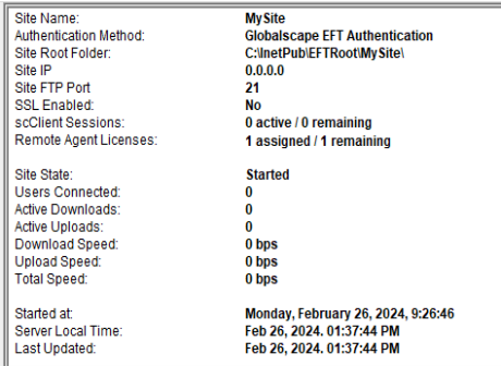 The Remote Agents license (RAM licenses) status can be viewed in the EFT administration interface, on the Status tab's Site node:
